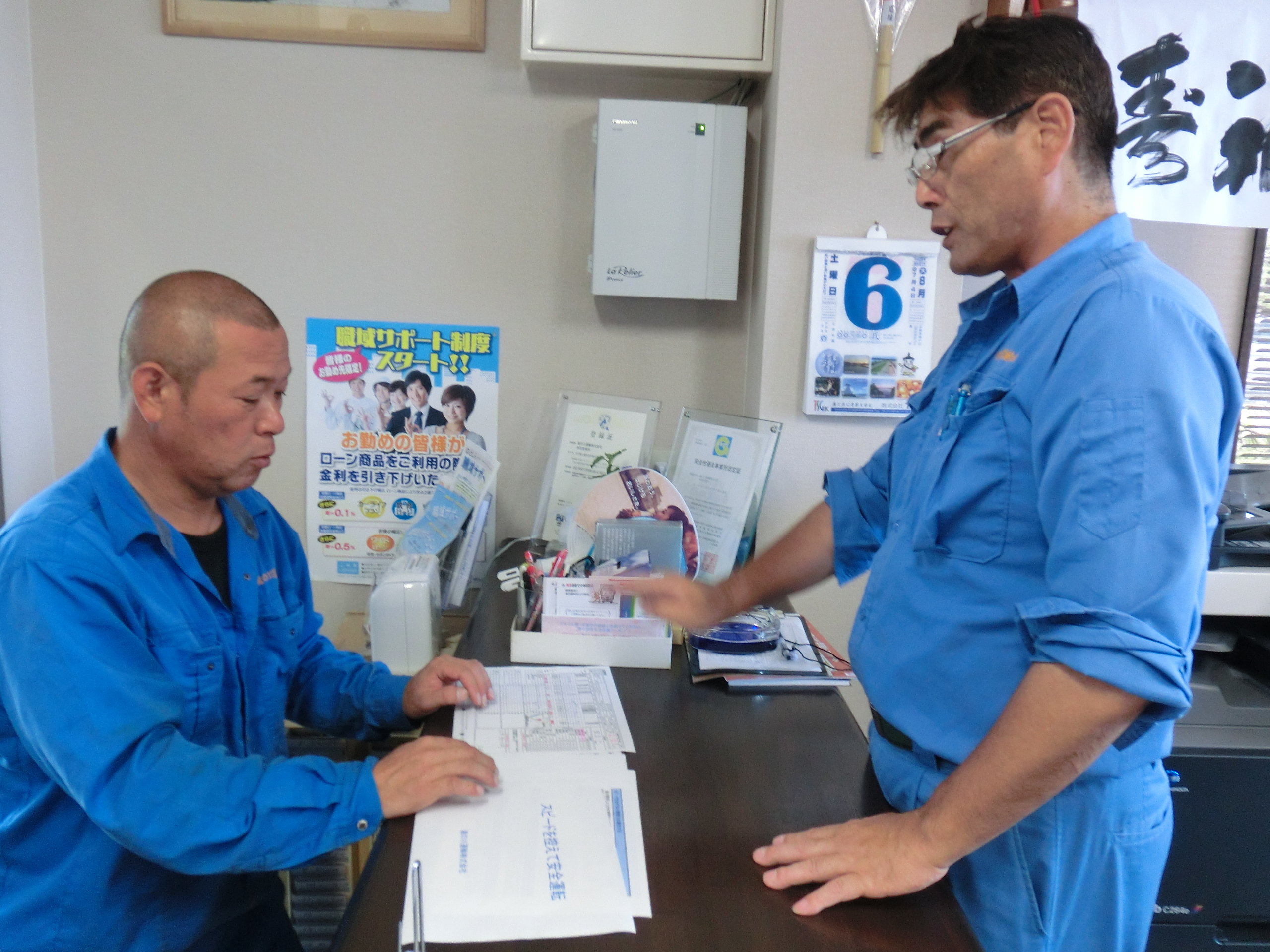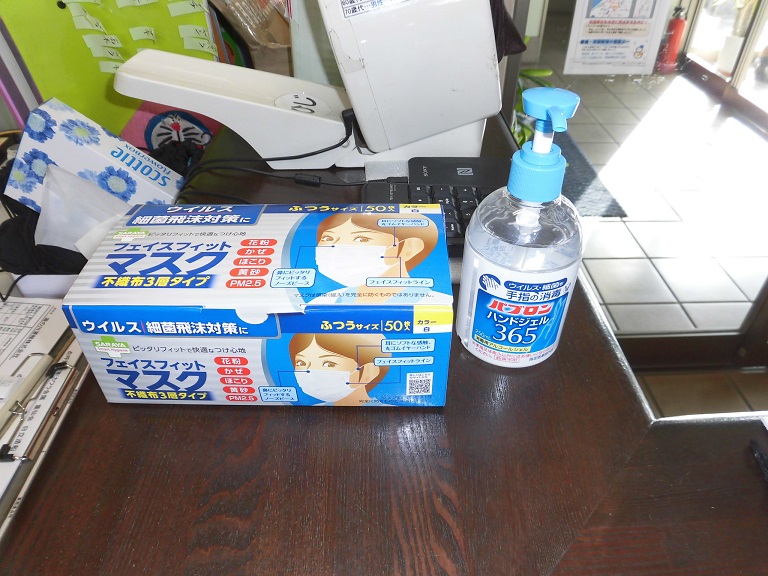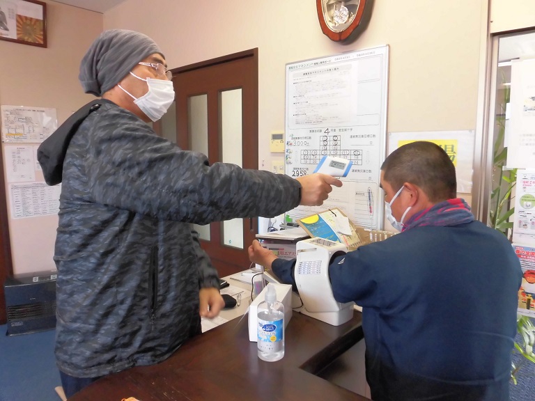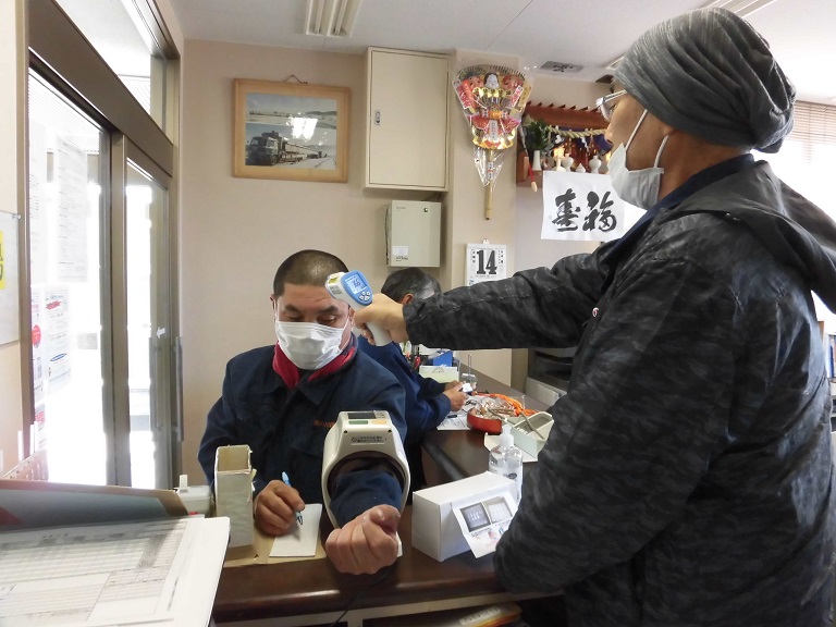 新型コロナウイルスの感染防止で、マスクの着用 手洗いの励行 アルコール消毒液での消毒 などを各自で行い 朝の点呼等で、体調の確認、非接触型体温計で体温を測り お客様のところにウイルスを持ち込まないように防止対策を行っています。 |