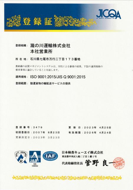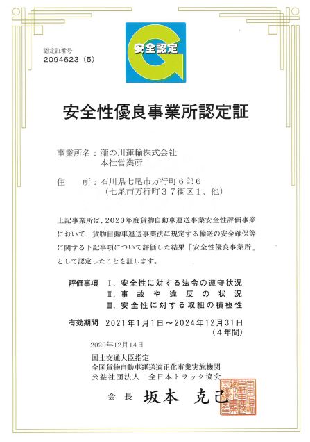 当社は 全国貨物自動車運送適正化事業実施機関(全日本トラック協会)が認定する「安全性優良事業所」です。