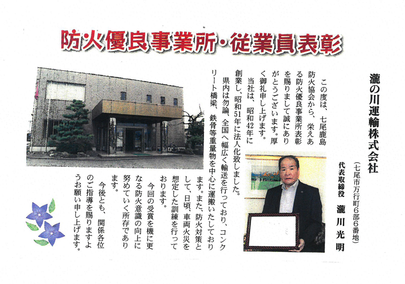 ●七尾鹿島防火協会から防火優良事業所表彰を賜わりました | |