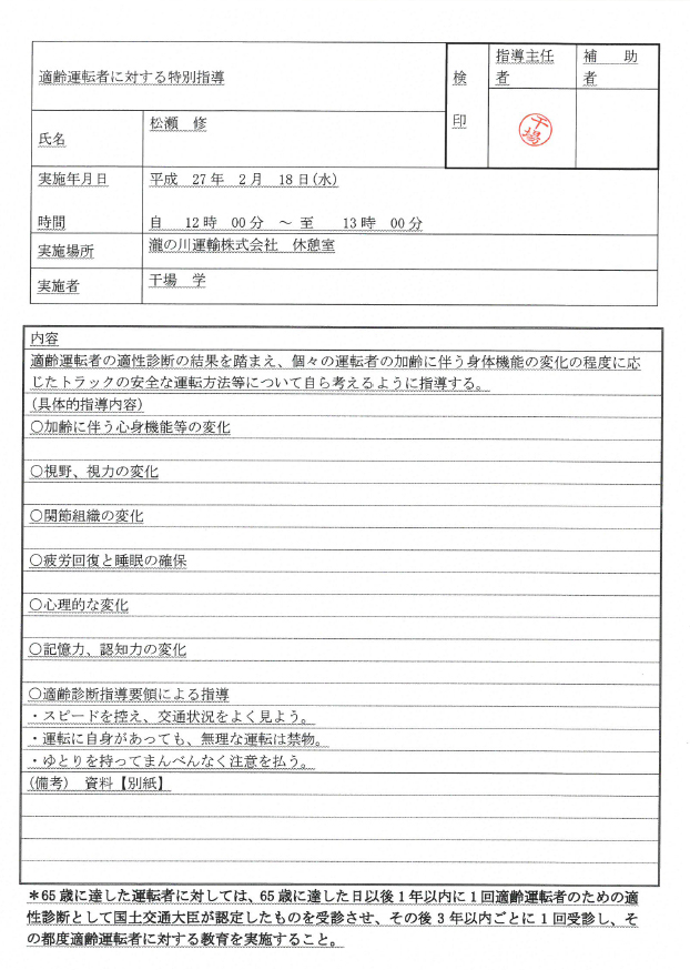 初任診断、適齢診断とは別に年1回運転適性検査を行い 診断結果を元に、ドライバー一人一人の運転癖や特徴を捕らえ 個々に合った適切な指導を行ない、無事故無違反の撲滅に取り組んでいます。 |